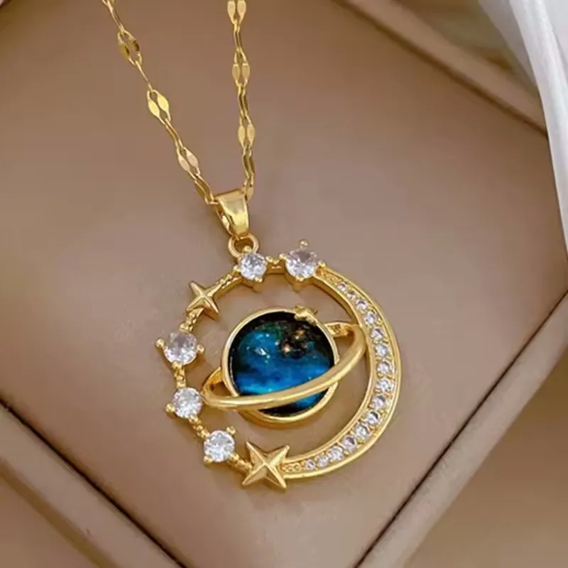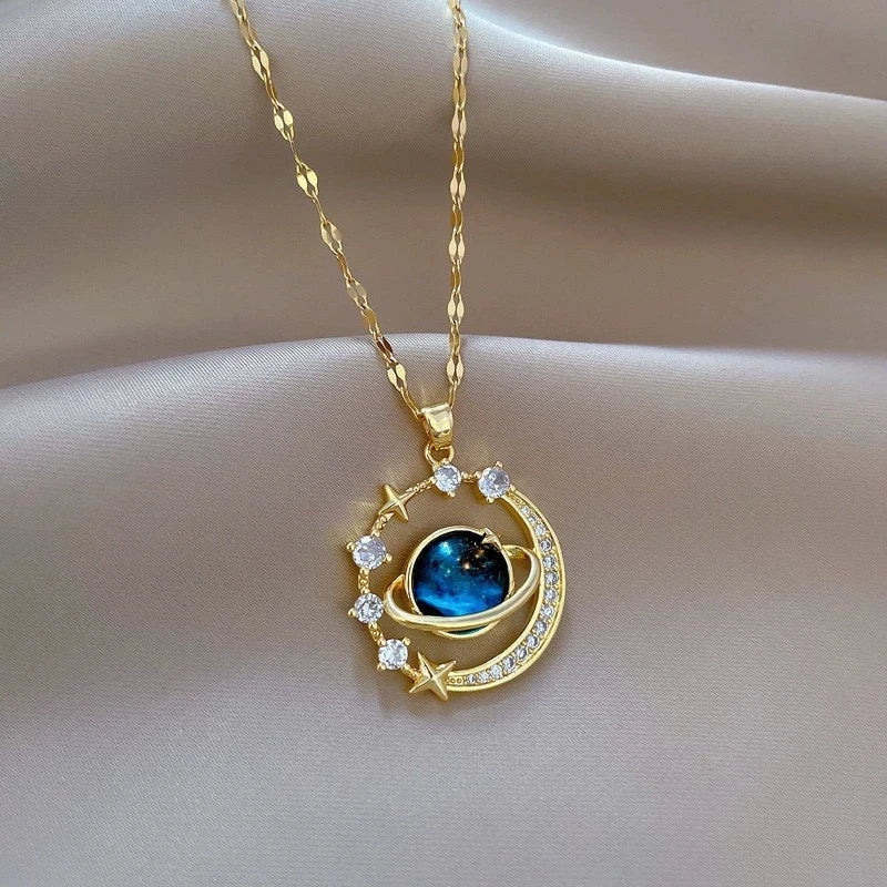 Collier Astronaute & Étoile – Pendentif Lune Doré en Alliage de Zinc